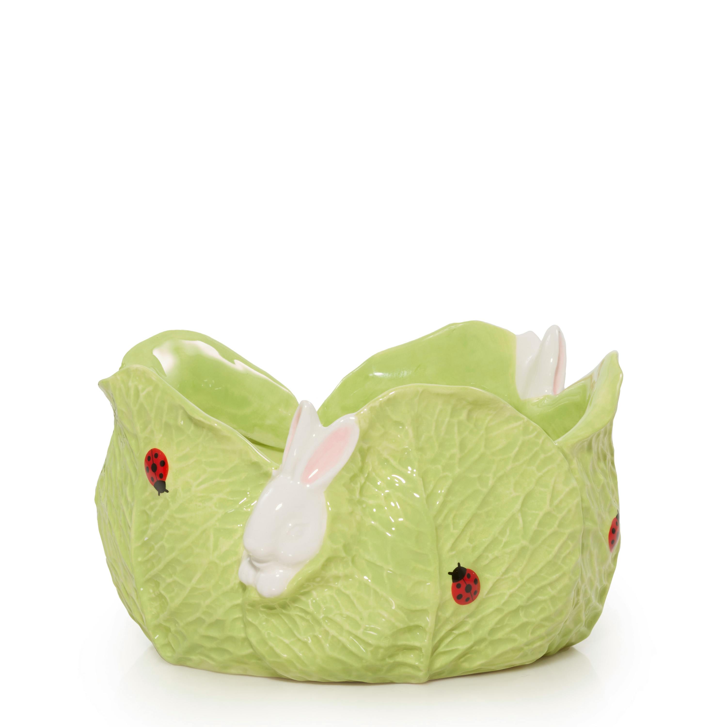 This hand-painted ceramic Jar Candle Holder features a pair of adorable bunnies peeking through some leafy greens with their ladybug friends.