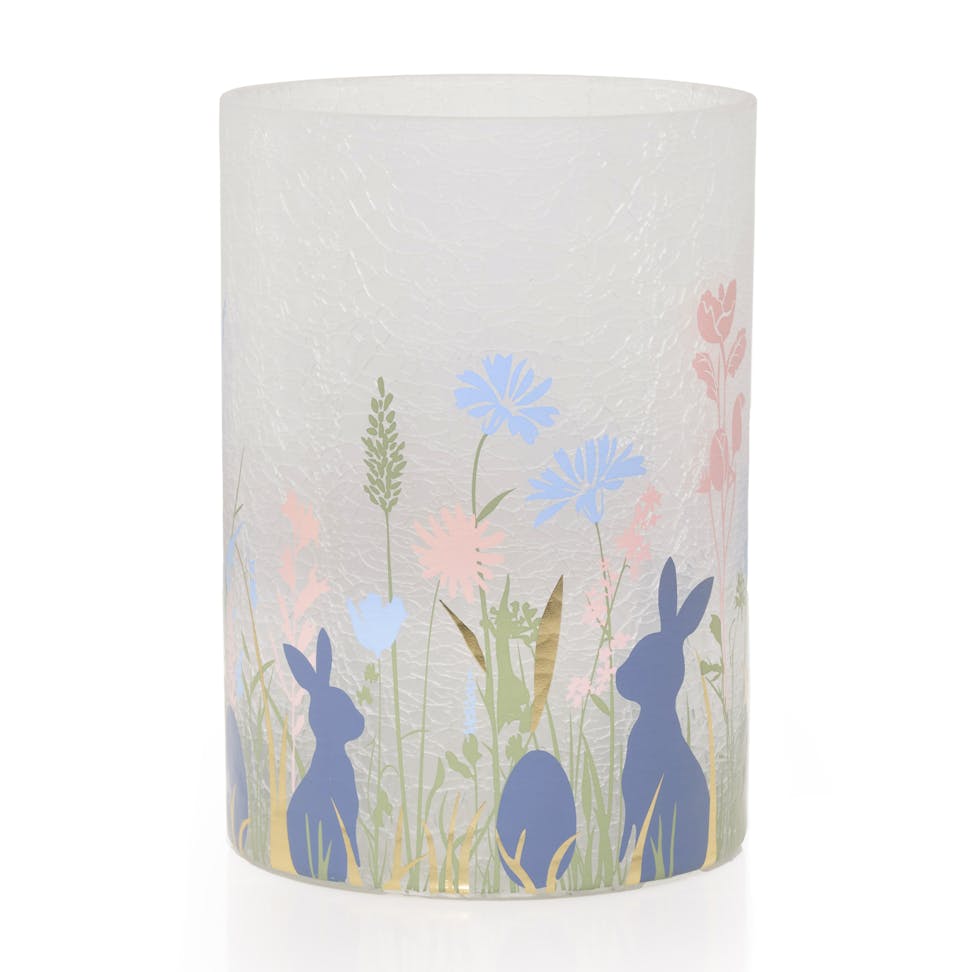 This charming Jar Candle Holder features a group of rabbits frolicking in a field of flowers alongside eggs hidden in the grass. Made of glass with a frosted spray finish and gold foil accents.