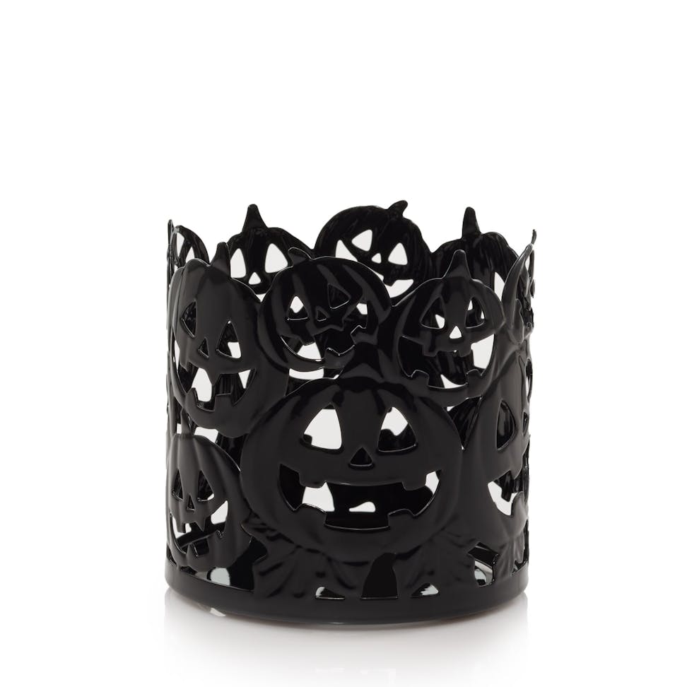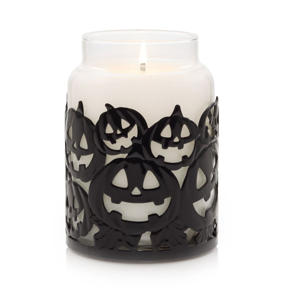 Halloween doesn’t have to be scary — it can be fun! A group of jack-o’-lanterns adorns this matte-black metal jar candle holder as they prepare to celebrate a night of fright with smiles for the trick-or-treaters.