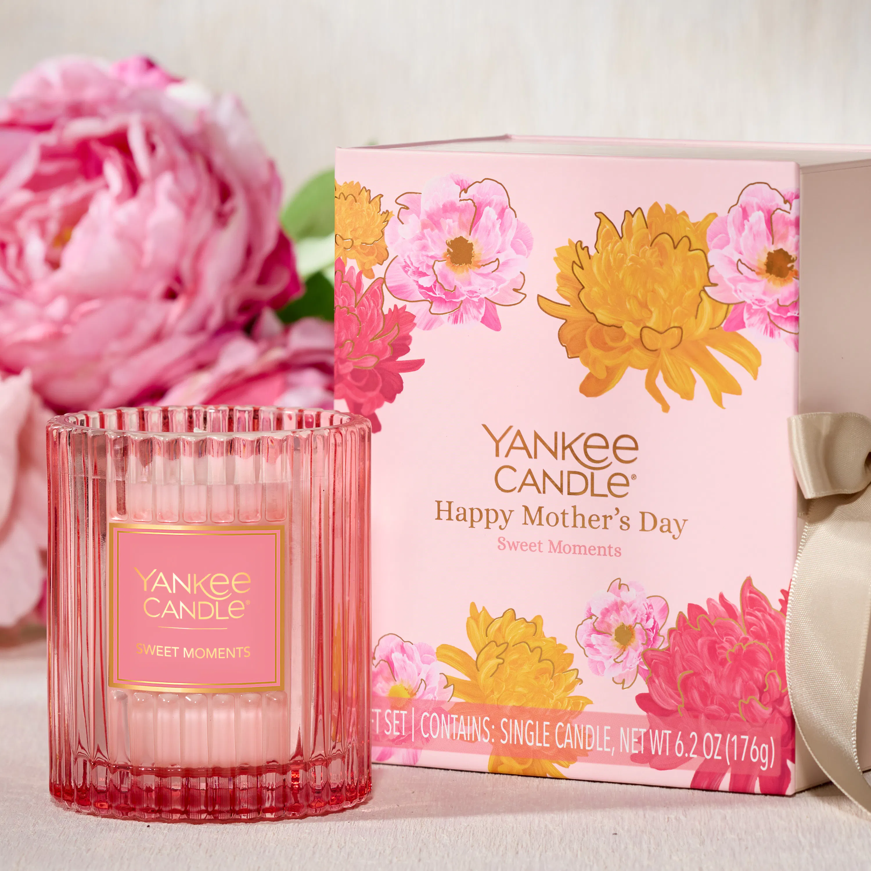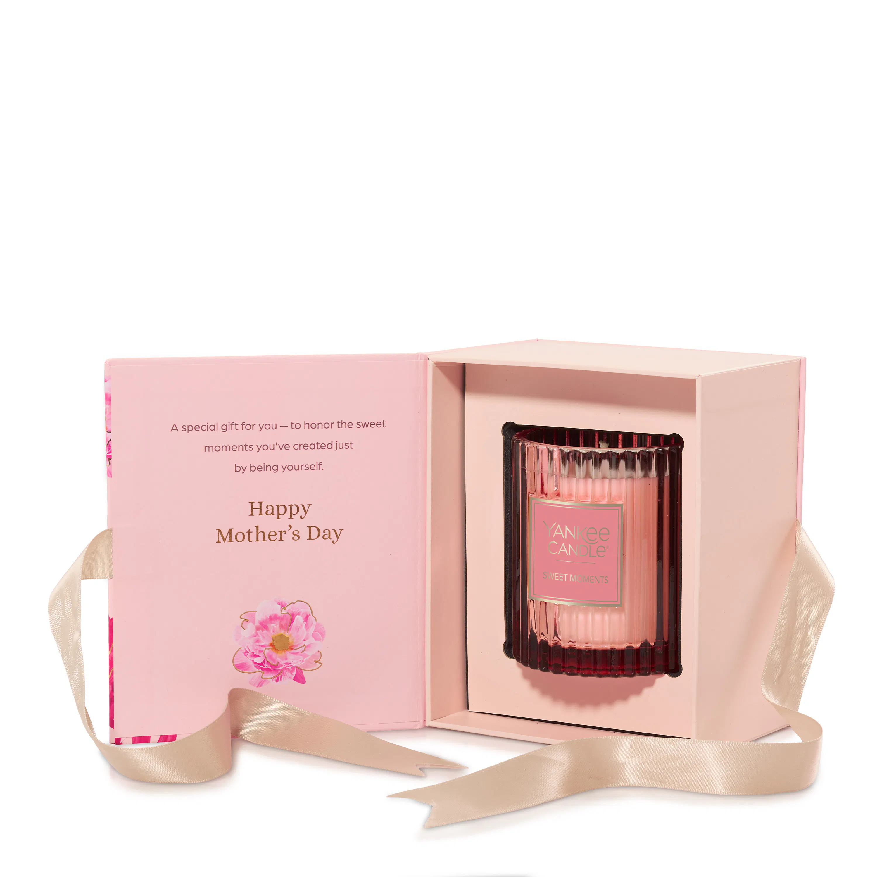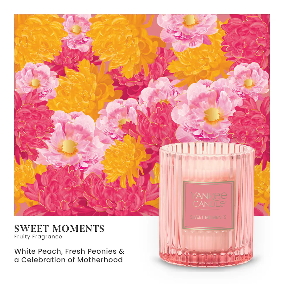 Moms deserve to be celebrated. Show her your appreciation this Mother’s Day with a curated gift set featuring our Sweet Moments fragrance in a textured-glass tumbler candle. This scented candle comes in a pink box decorated with beautiful floral artwork, gold foil accents, and ribbon closure with a panel that opens to reveal a caring message — reminding her how special she is.