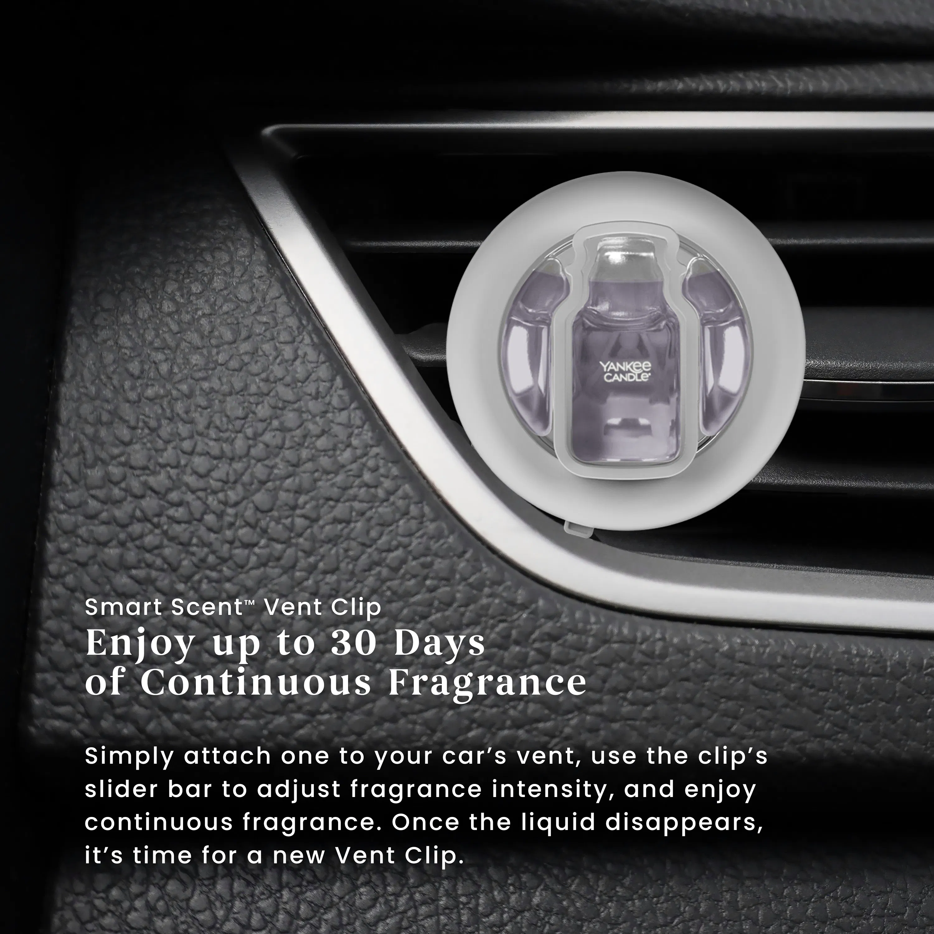 Smart Scent™ Vent Clips fill your car with true-to-life Yankee Candle® fragrances. Create a welcoming mood you'll enjoy sharing with whoever's along for the ride, anywhere your journey takes you.